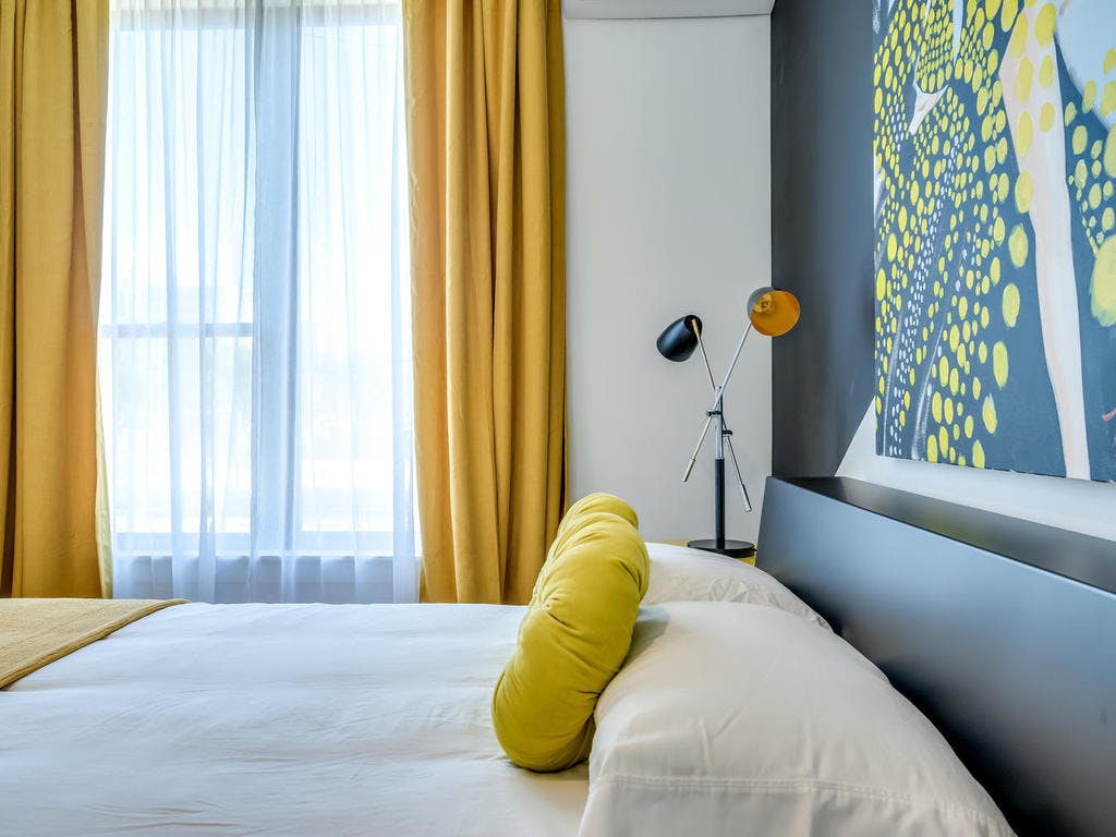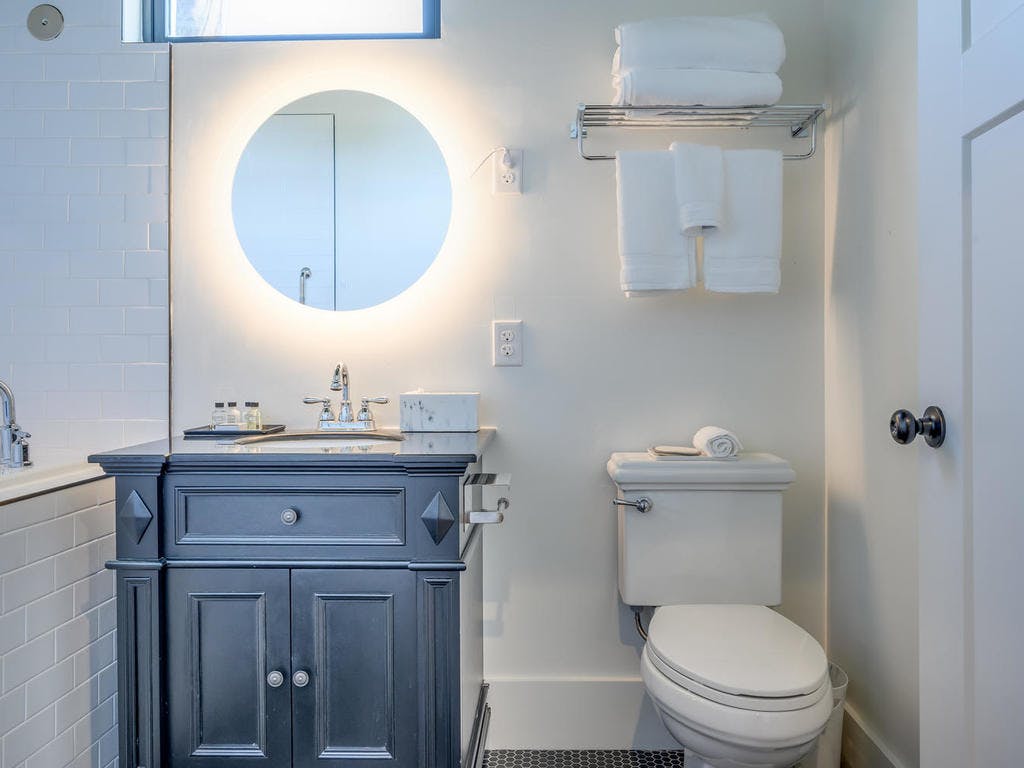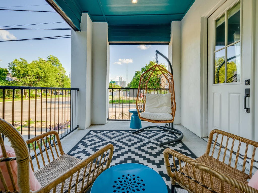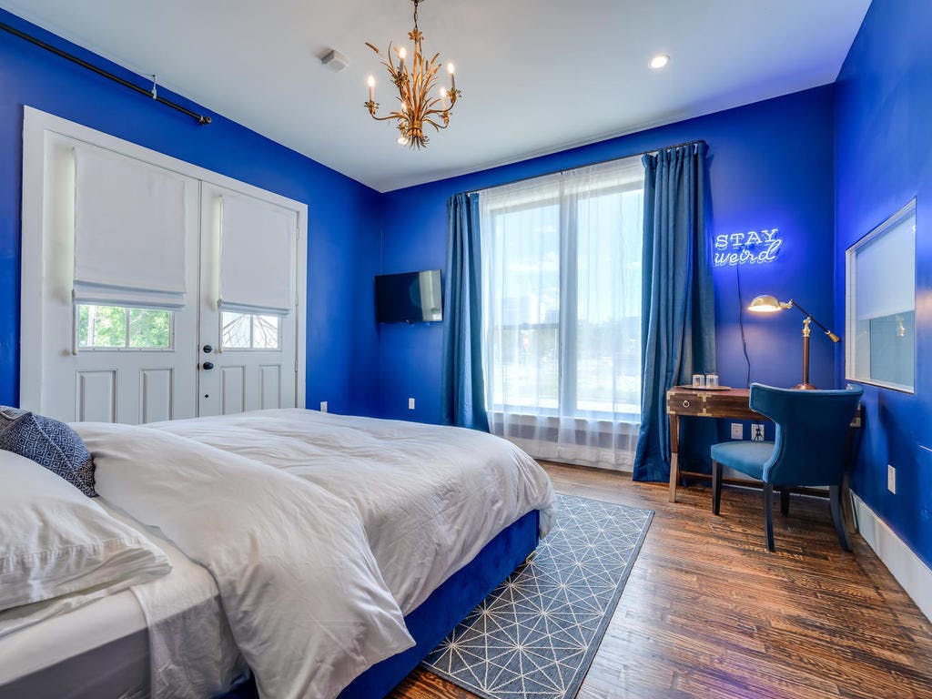 This 530 sq ft large first floor suite has a deluxe Japanese Jacuzzi for your spa experience. A mid-century blue and brass themed room with a velvet king size platform bed and an adjoining room with a queen size bed featuring Casper™ mattress the ultimate in sleep technology.. The black, white and yellow color theme of the adjoining room reflects a local artist's painting inspired by Japanese Contemporary Artist Yayoi Kusama's creation. The room has a porch with an outdoor seating area. Sleeps up to 4.